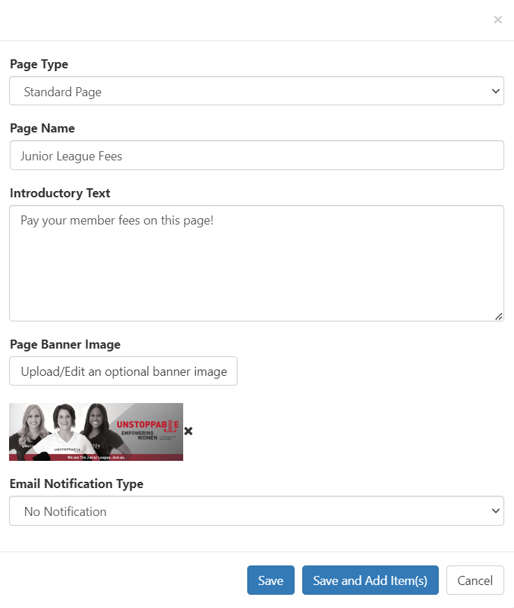 - Upload a banner image for your page. Any JPG or PNG can be used with the dimensions of 1110px by 320px.
