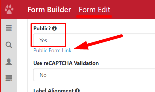 - Find the Public? form field, and underneath that, you should see a link that reads Public form link