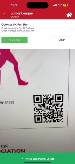 - Invalid Scan Date for ETicket - If you try to scan an eticket for a different event, it will not scan successfully. The Scanner recognizes the eTicket, but will know that this QR code is not tied to this paid event. For example, if someone from Week 2 of the Fun Run shows up but it's the Week 1 event, it will not be redeemed.
